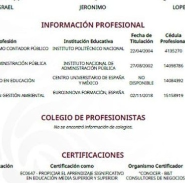 Además, su currículum oficial publicado en el portal de la SEP (https://acortar.link/CoEqFD) presenta inconsistencias adicionales, pues afirma tener un doctorado en Administración Pública por la Universidad Anáhuac, distinto al doctorado en Educación que figura en el registro de cédulas.